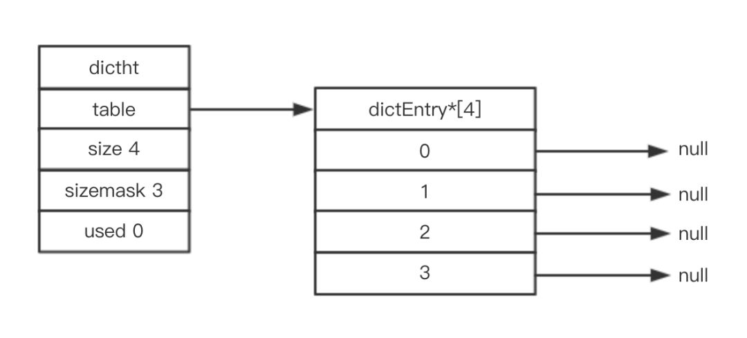 实体化一下,如下图所指一个大小为4的空哈希表(Redis默认初始化值为4):