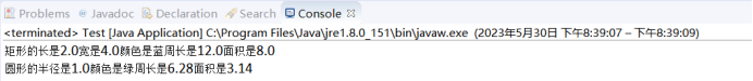 System.out.println("矩形的长是"+length+"宽是"+width+"颜色是"+color+"周长是"+getPer()+"面积是"+getArea());