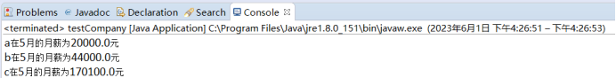 System.out.println(c.name + "在" + month + "月的月薪为" + c.getSalary(month) + "元");