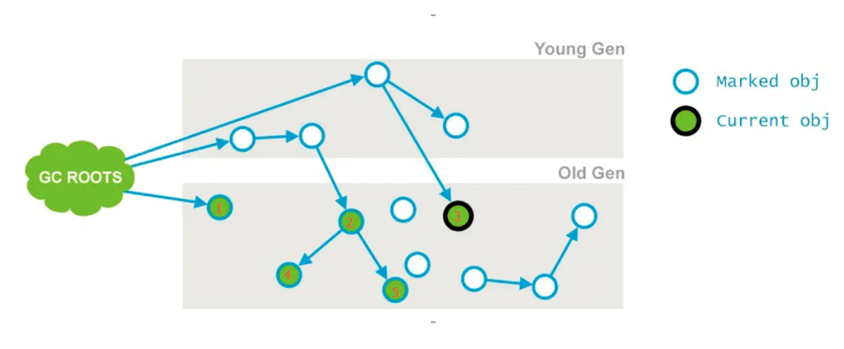 如下图所示,也就是对象1、2、3,最终会找到对象4和5。并发标记的特点是和应用程序线程同时运行。并不是老年代的所有存活对象都会被标记,因为标记的同时应用程序会改变一些对象的引用等。