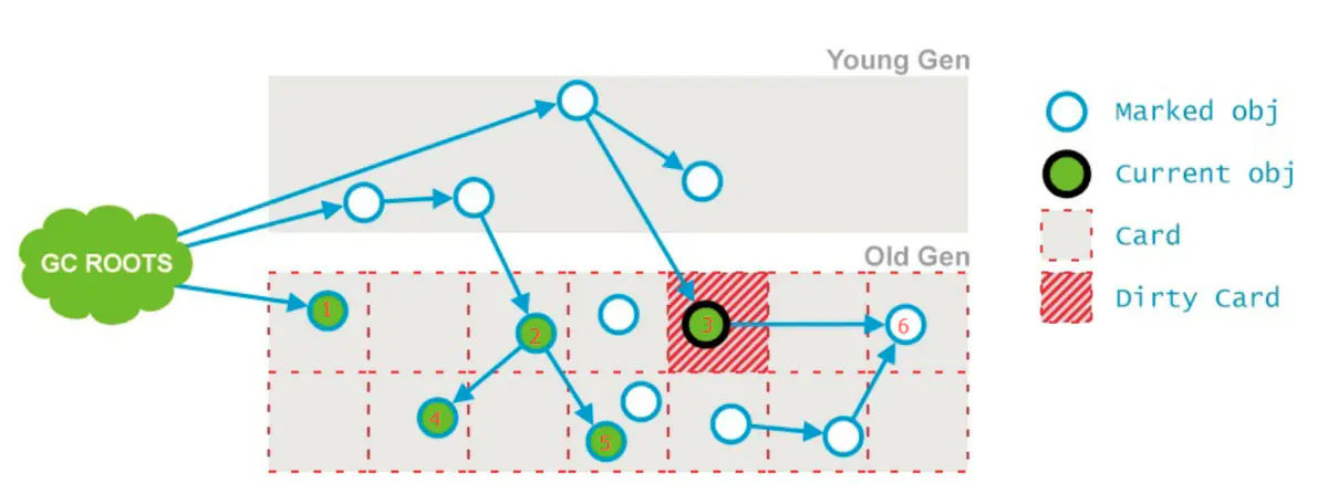 此阶段不会STW,前一阶段已经说明了,不能标记出老年代所有的存活对象,是应为标记是与用户线程并发执行的,会改变一些对象引用,而,并发预处理这个阶段是用来处理前一个阶段变化的对象,它会扫描标记为Dirty的Card,如下图所示,在并发清理阶段,节点3的引用指向了6;则会把节点3的card标记为Dirty,最后将6标记为存活;可使用 -XX:-CMSPrecleaningEnabled 来关闭,默认开启,其目的是为了让最终/重新标记阶段的STW时间尽可能短。