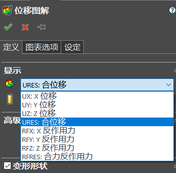 这个样子,右上角是个u字,而URES:合位移、UX:X位移这些前边都带了个U字,很容易知道,在这里u代表位移之类的意思,但是我也不太确定。软件为我们提供了这么多选择,我们可以很方便地挑选我们需要的位移图解。