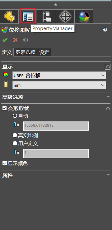 要显示此 PropertyManager,请运行静态、非线性、动态或掉落测试算例。右键单击结果 文件夹,然后选择定义位移图解。