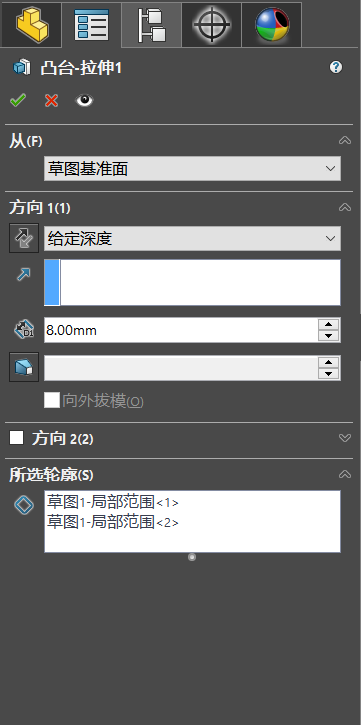 ②“您可以使用设定PropertyManager来控制边缘图解的显示”,说到这里,大家可能有疑问,什么是PropertyManager?PropertyManager的中文意思就是属性管理器,其实我们现在就在属性管理器里边,就是以下左图这个样子的东西,鼠标移到上边,也会出现白底黑字的提示“PropertyManager”。这里还要再老生常谈地再强调一次,就是“看图标,不看名字”,一个东西对应一个图标,但是这个东西却有可能有好几个名字,之前我们也见到过那种例子,所以我们要更关注这个东西的图标大致长什么样子,而不是准确记住他的名字。其实在很多时候软件都会自动跳到PropertyManager,比如我们在拉伸凸台的时候,如以下右图,我们操作的这个界面就是PropertyManager,只是我们大多数时候都没有注意到这点,我也是在写这个文章的时候才注意到这个。