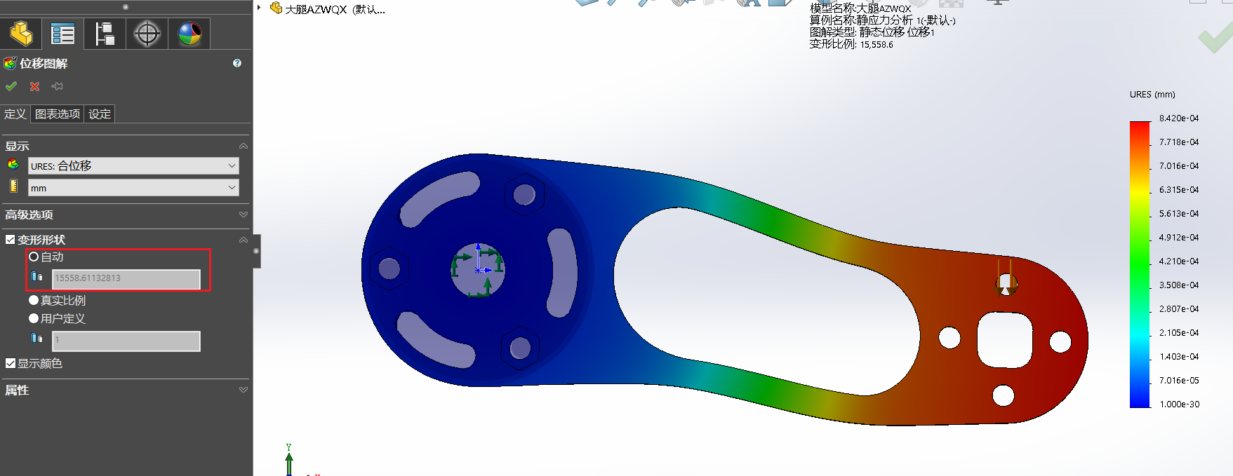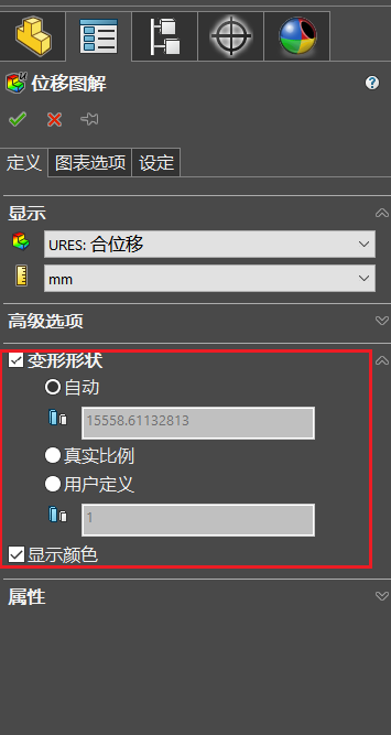 ②话不多说,就分别勾选一下 “自动”、“真实比例”、“用户定义”来试试,如下图。其实简单来说,“自动”、“真实比例”、“用户定义”的区别就是比例因子的不同,“自动”是软件自动算出来的最佳的比例因子,能让位移看起来更明显,同时又不过于夸张;“真实比例”就是比例因子为1;“用户定义”就是用户可以自己写个比例因子。可能新手做仿真的时候会惊讶:妈耶,变形怎么这么大?其实实际中的是“真实比例”的情况,而不是“自动”的情况,“自动”的情况只是为了让位移显示得更加明显罢了。
