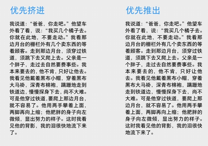 在日常的排版中我们会优先选择方法2,也就是使用挤进上一行,因为这样可以避免推出时拉开上一行的间距导致上一行看起来稀疏,让人感觉一字一顿