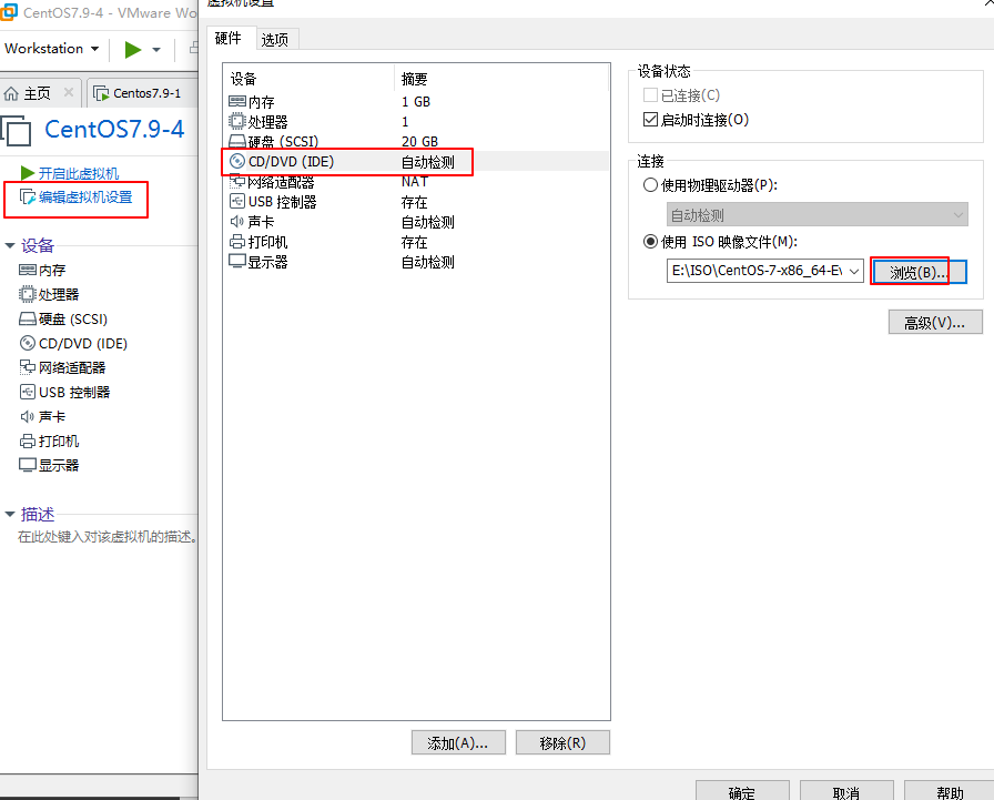(3)编辑虚拟机设置,选择光驱并浏览选中合适的镜像文件