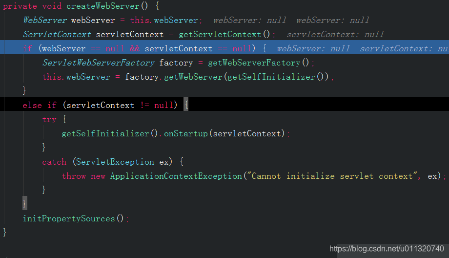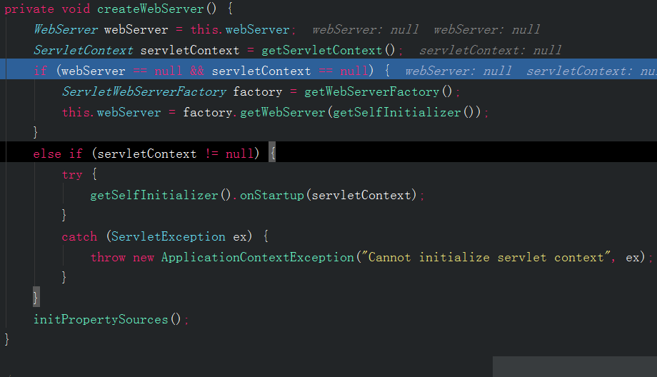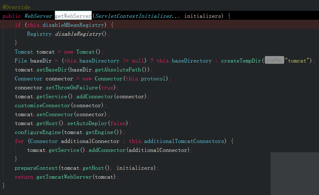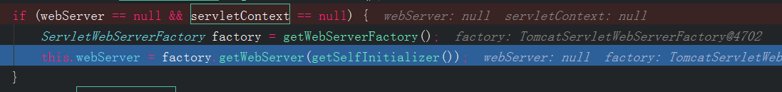 ServletWebServerApplicationContext.createWebServer从名字上看应该就是创建一个服务了,我们的tomcat服务或许就在这里被创建