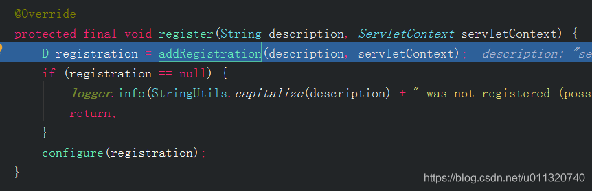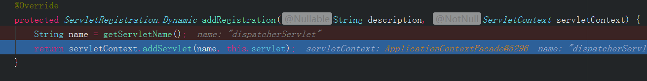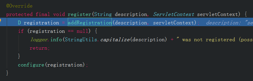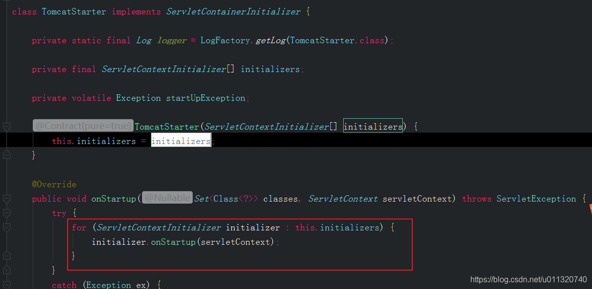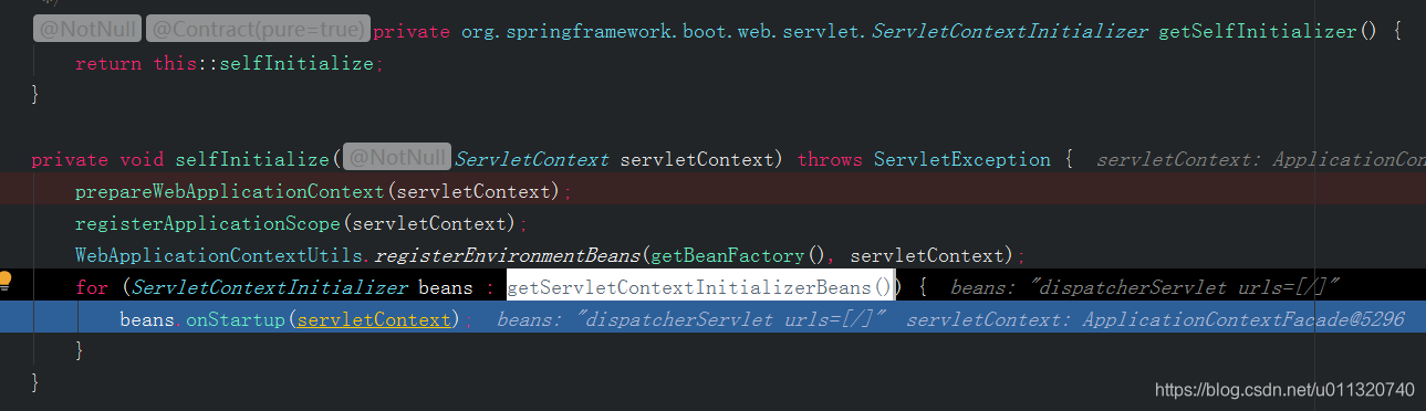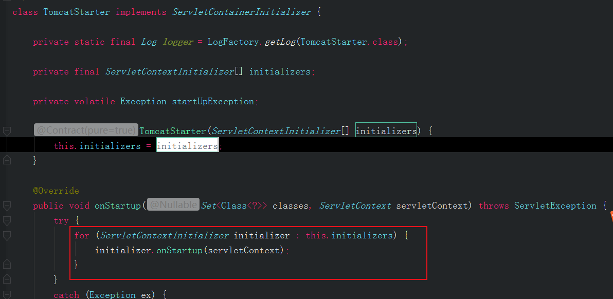 焕然大悟,是不是就是这个接口,前面文章中讲到过在META-INF/services/javax.servlet.ServletContainerInitializer配置实现ServletContainerInitializer该接口的类将会在tomcat启动时被调用到onStartup,而我们这里虽然不是如第一章所说那样通过spi调用,但是我们这里显示的为他赋值一个ServletContainerInitializer的实现类TomcatStarter,这样就完成在tomcat启动时调用到TomcatStarter.onStartup方法,然后我们看一下圈红位置,拿到我们传入的面向接口编程的ServletContextInitializer,然后调用该类(DispatcherServletRegistrationBean)下的onStartup进行dispatcherServlet的注入到ServletContext中