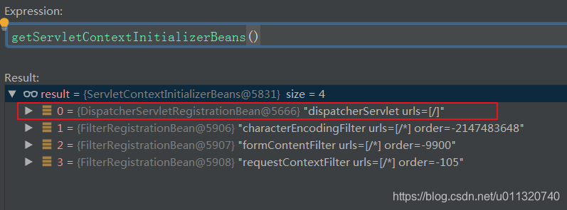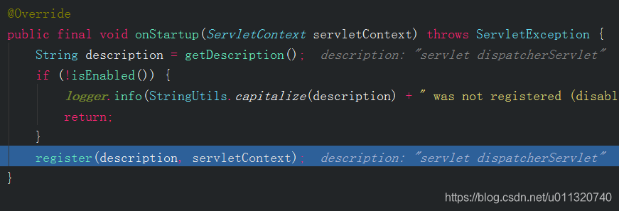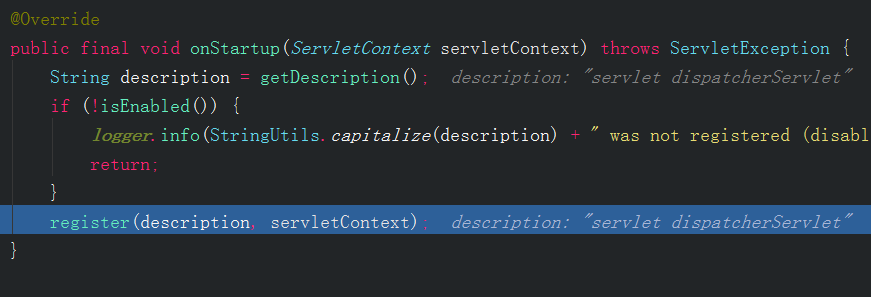 这里面就有我们的前面定义的DispatcherServletRegistrationBean,调用DispatcherServletRegistrationBean.onStartup方法