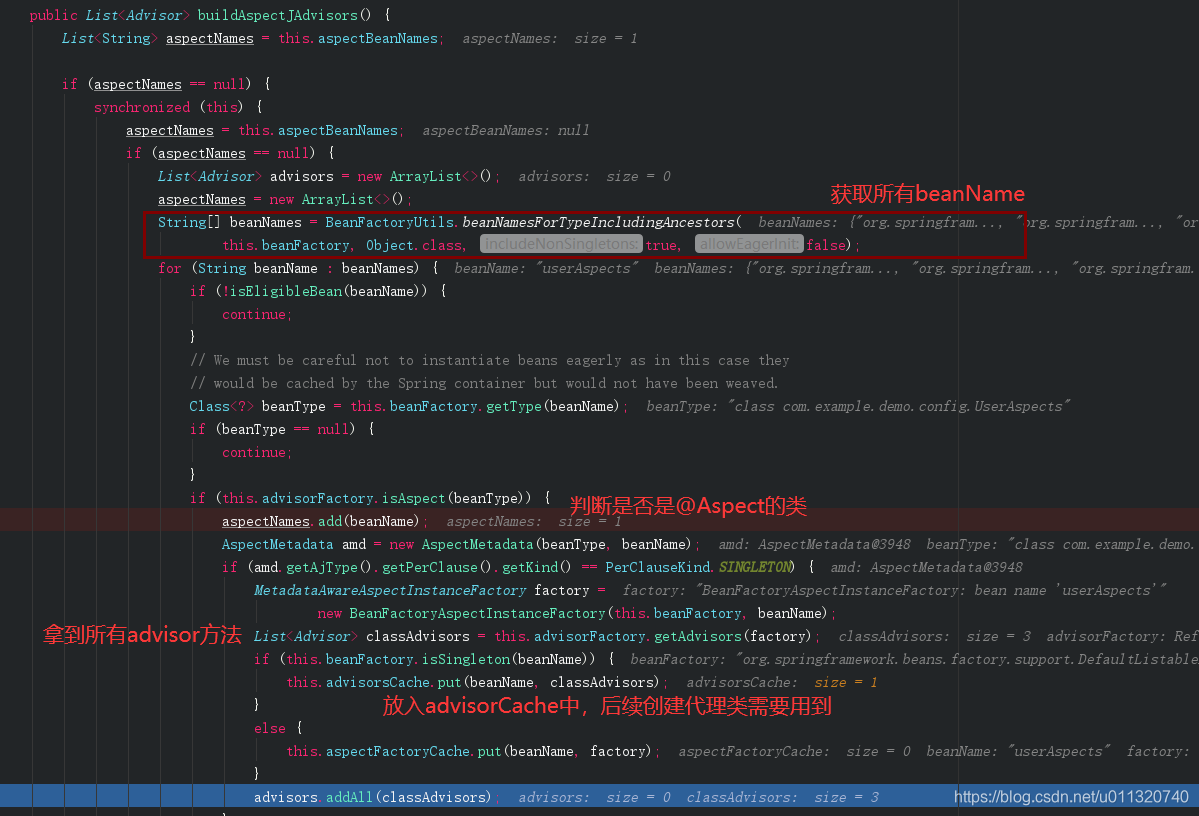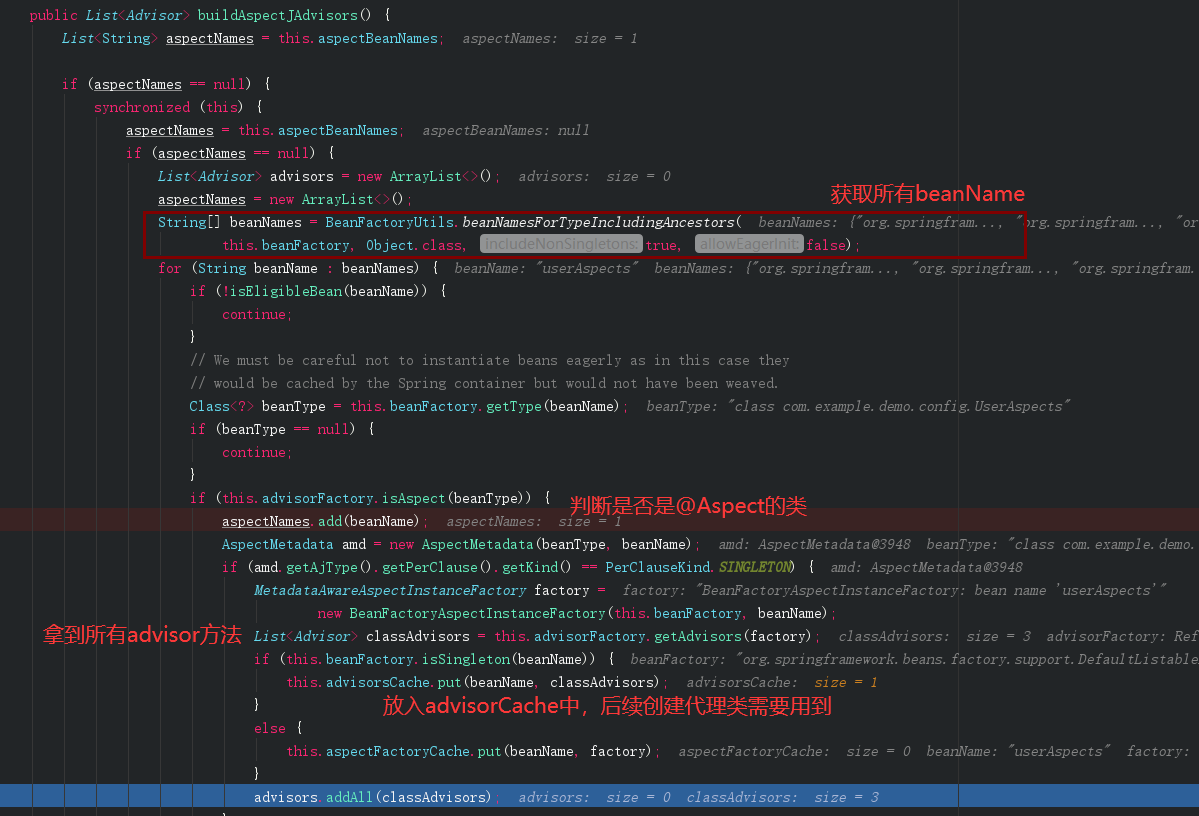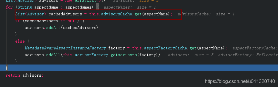 到这里不就是前面调用了buildAspectJAdvisors放入缓存了吗