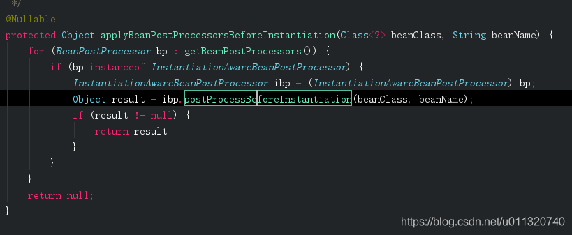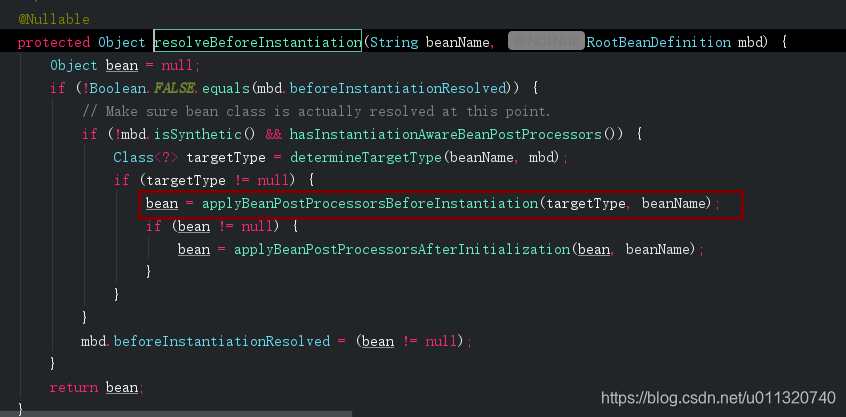 我们往里走AbstractAutowireCapableBeanFactory.resolveBeforeInstantiation