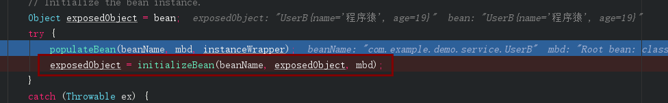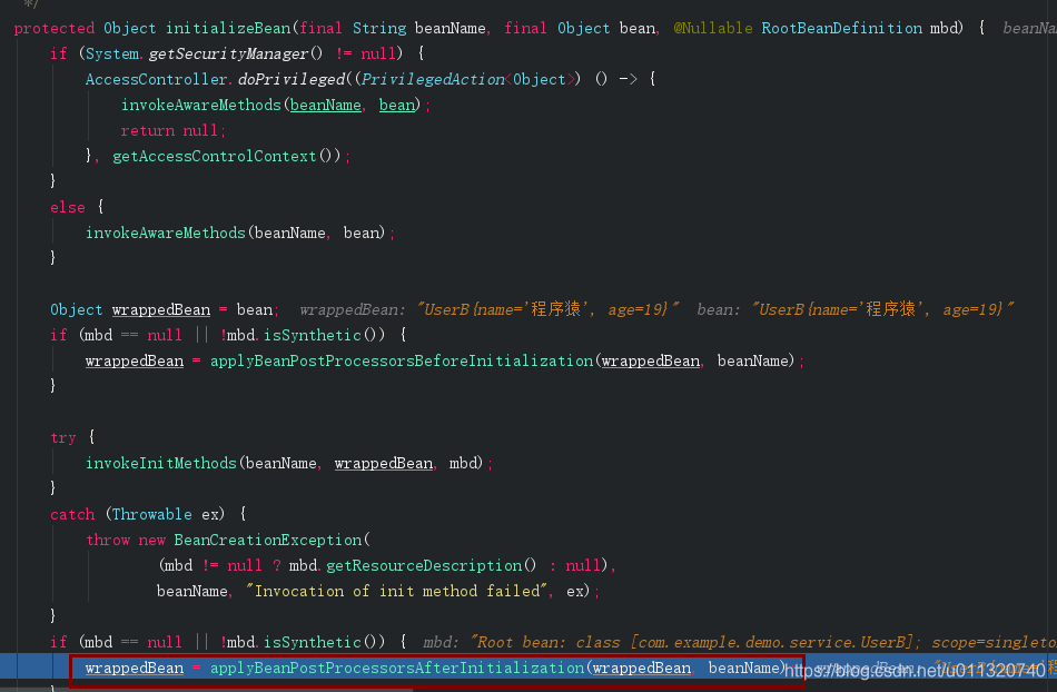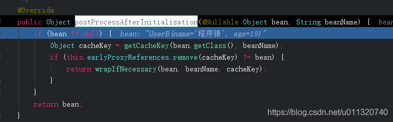 接着在bean实例化放入beanFactory三级缓存后进入initiallizeBean,在这里将会返回一个代理对象