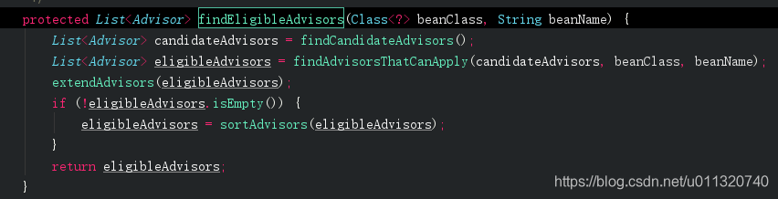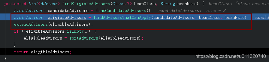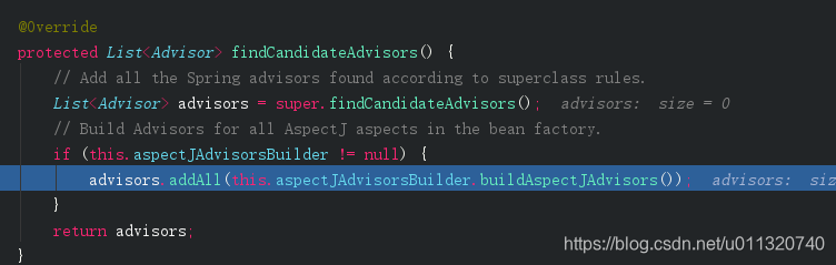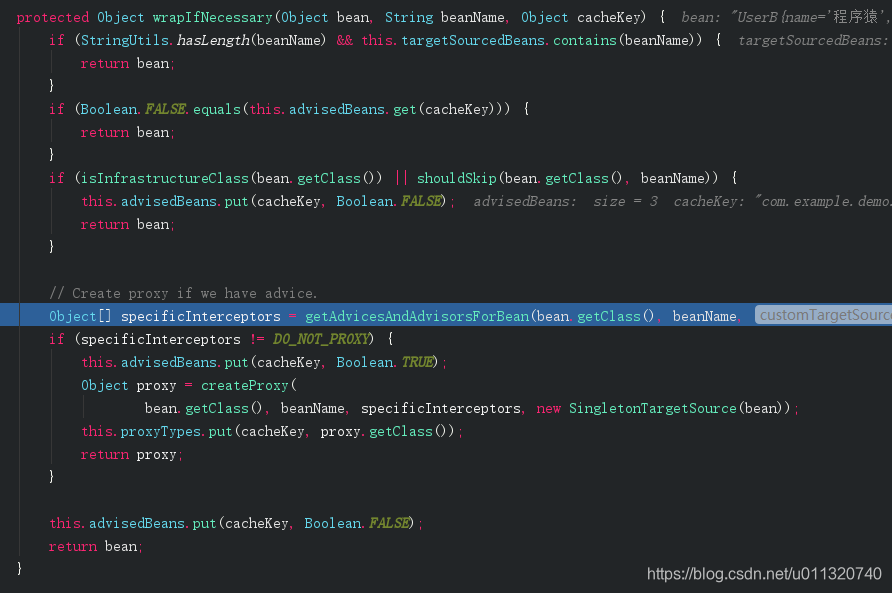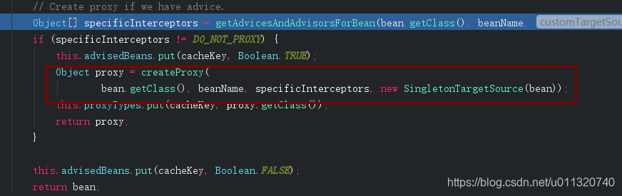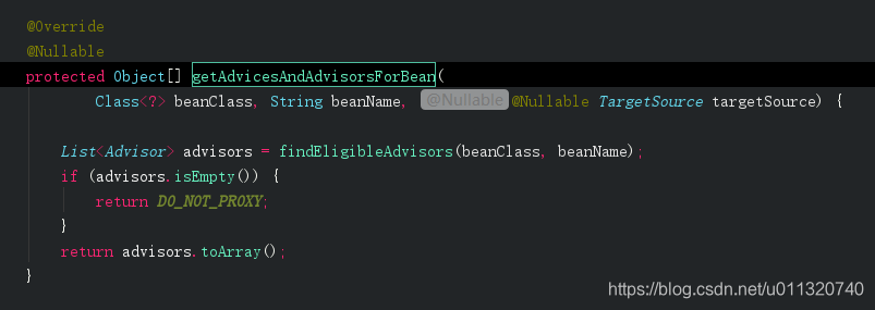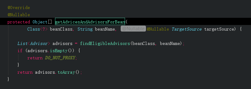 getAdvicesAndAdvisorsForBean这里是获取前面我们放入缓存里的advisor,注释上可以看出如果能获取到该类的advice那么就需要创建代理对象