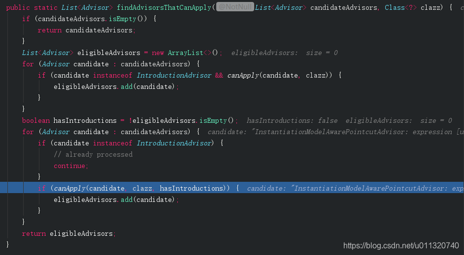 调用AopUtil.canApply用来判断该类是否是切点的类,如果是那么就将Advisor放入返回