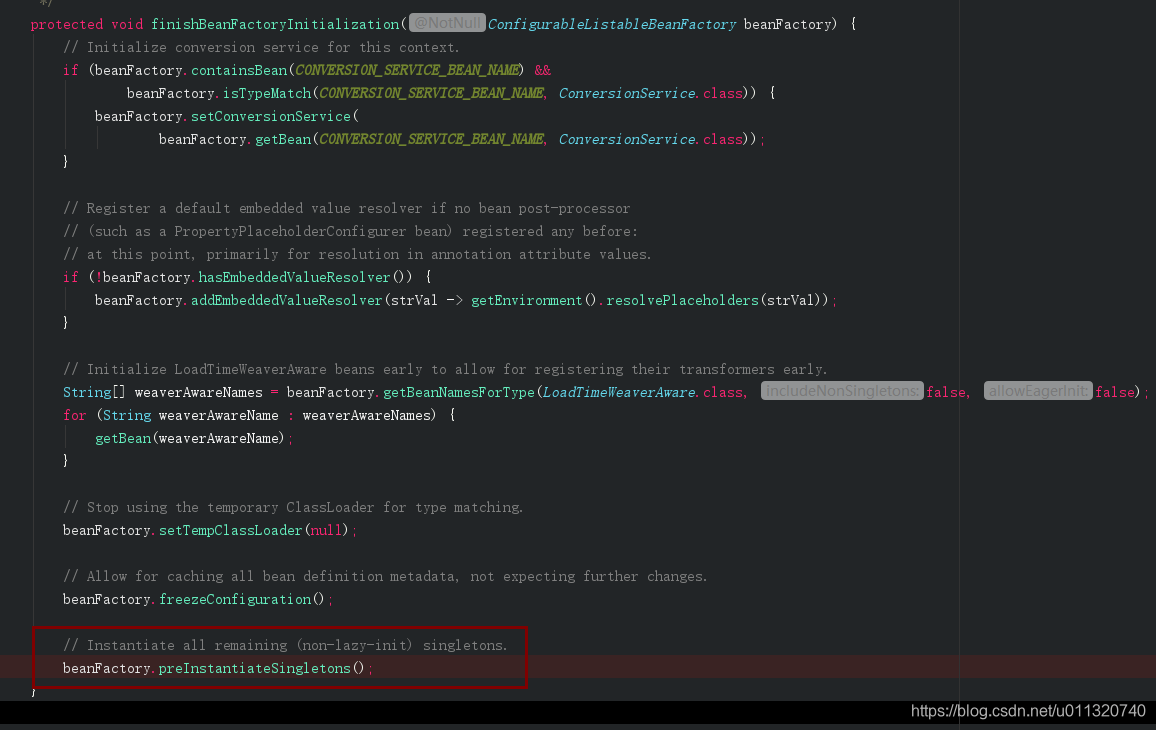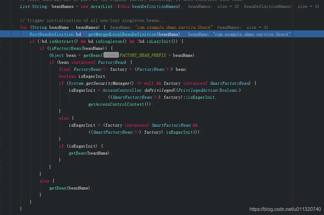 这里接着调用DefaultListableBeanFactory.preInstantiateSingletons进行实例化,进去看看,下面是部分代码