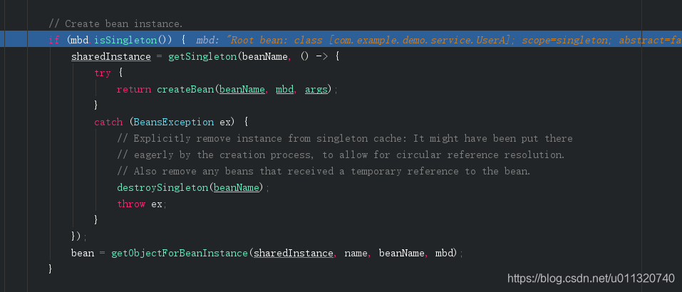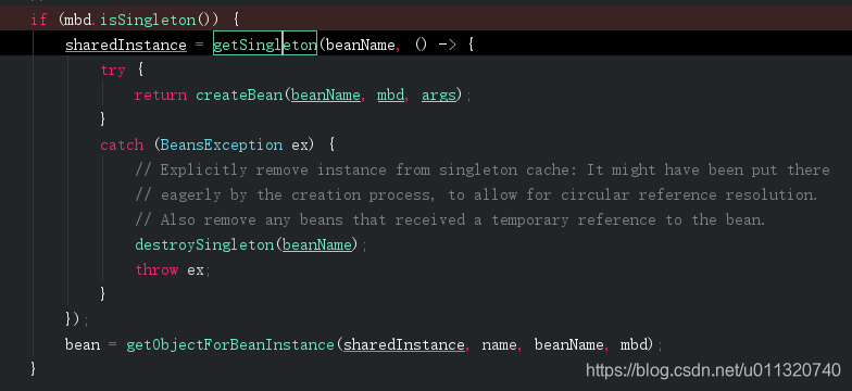 这里面你会发现它放在singletonFactories里,而我们在getBean的时候是在singletonObjects里拿,这个是三级缓存,用来解决循环依赖的问题,这里就不讲这个了,我们关注他什么时候放入singletonObjects;
