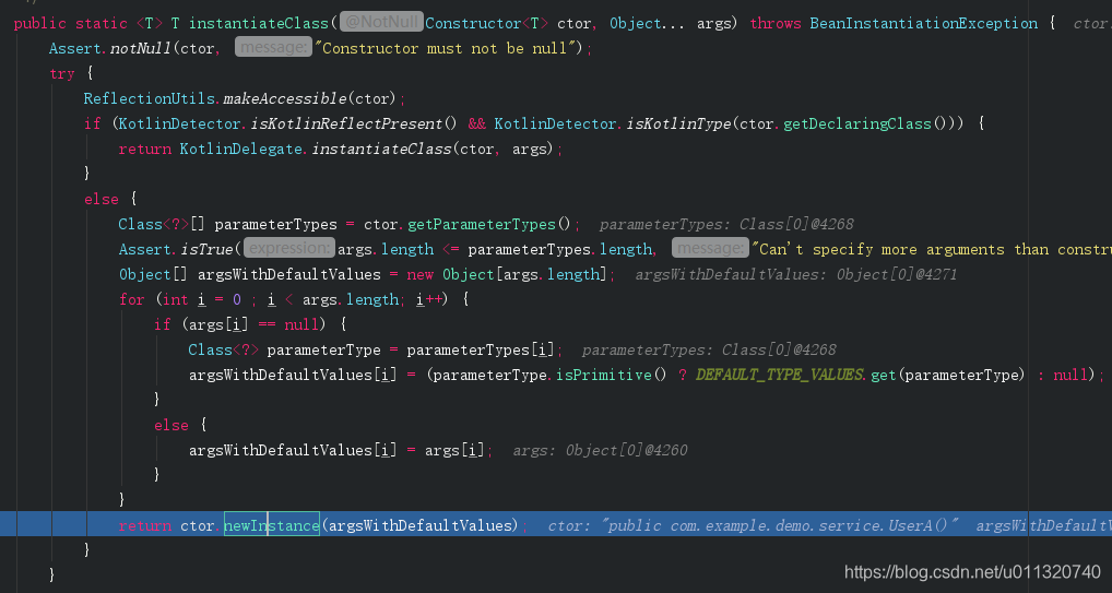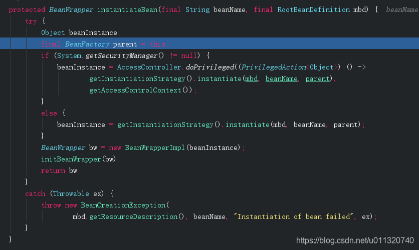 进入createBeanInstance方法,下面是部分代码,该方法的最后一句