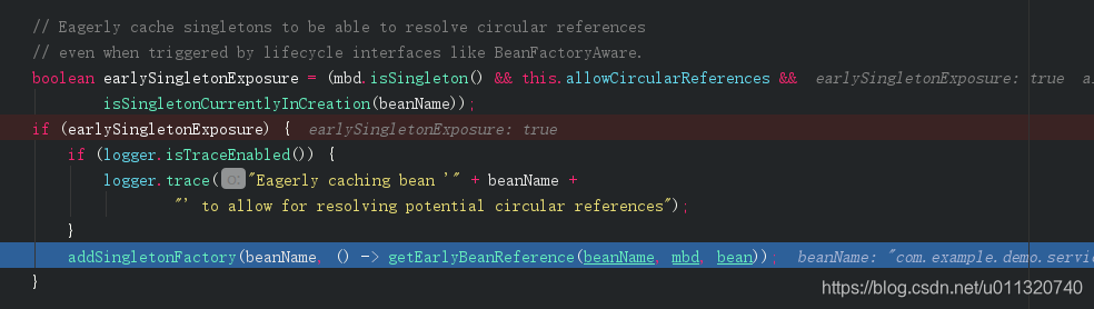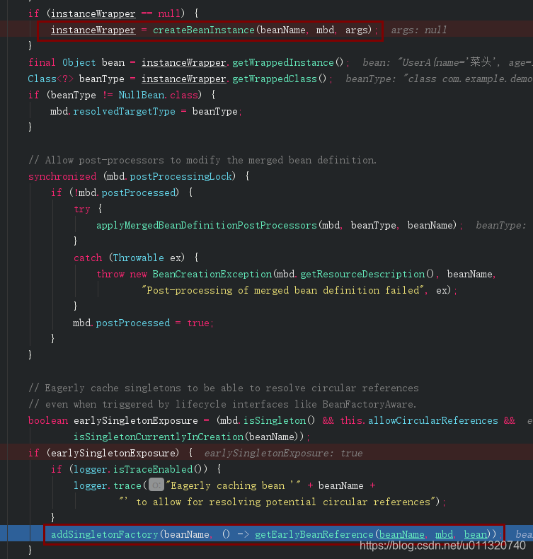 回到刚刚的AbstractAutowireCapableBeanFactory.doCreateBean,在调用完createBeanInstance之后接着进入addSingletonFactory
