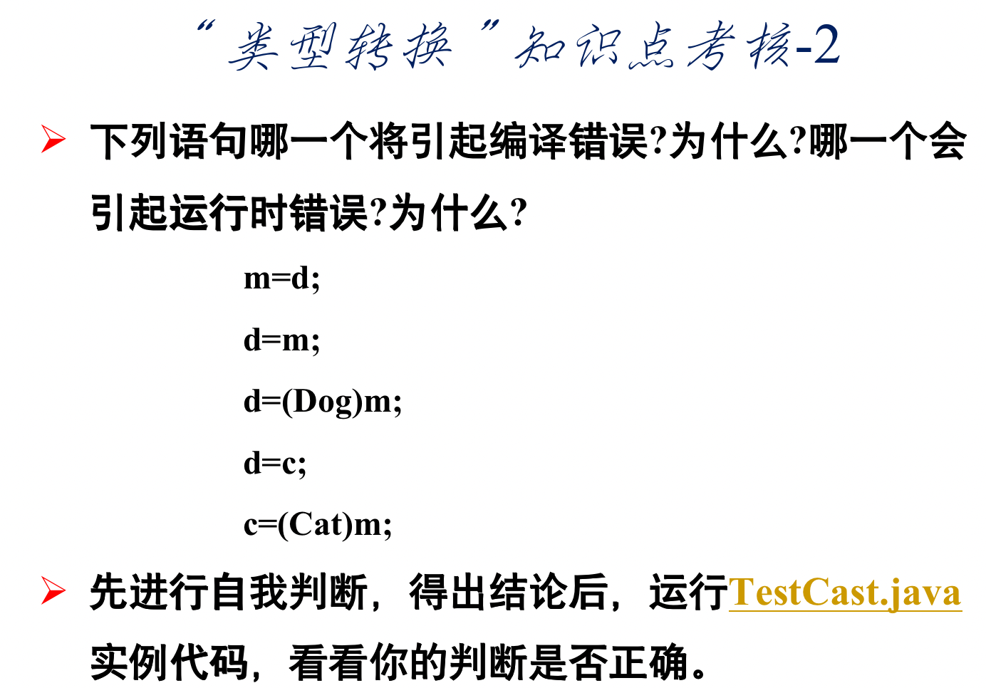 基类对象要赋给子类对象变量,必须执行类型转换,其语法是: 子类对象变量=(子类名)基类对象名;