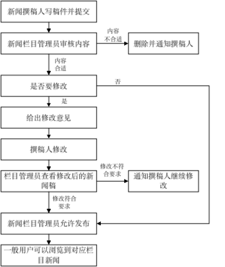 河北省环保监测中心网络新闻为搭建公众信息交流平台,决定建立新闻发布平台。新闻发布平台按内容包括中心新闻、企业环保信息发布等若干新闻栏目,新闻撰稿人可登陆平台发布新闻,每个新闻栏目至少有一位新闻栏目管理员,负责审查新闻撰稿人所发的新闻稿件,在审查通过后,对应新闻才可以显示在对应新闻栏目上,一般用户登录后才可以看到,另外还可以删除过时或无用的信息。另外,系统管理员可以对用户进行管理和对新闻栏目进行调整。新闻发布流程如下: