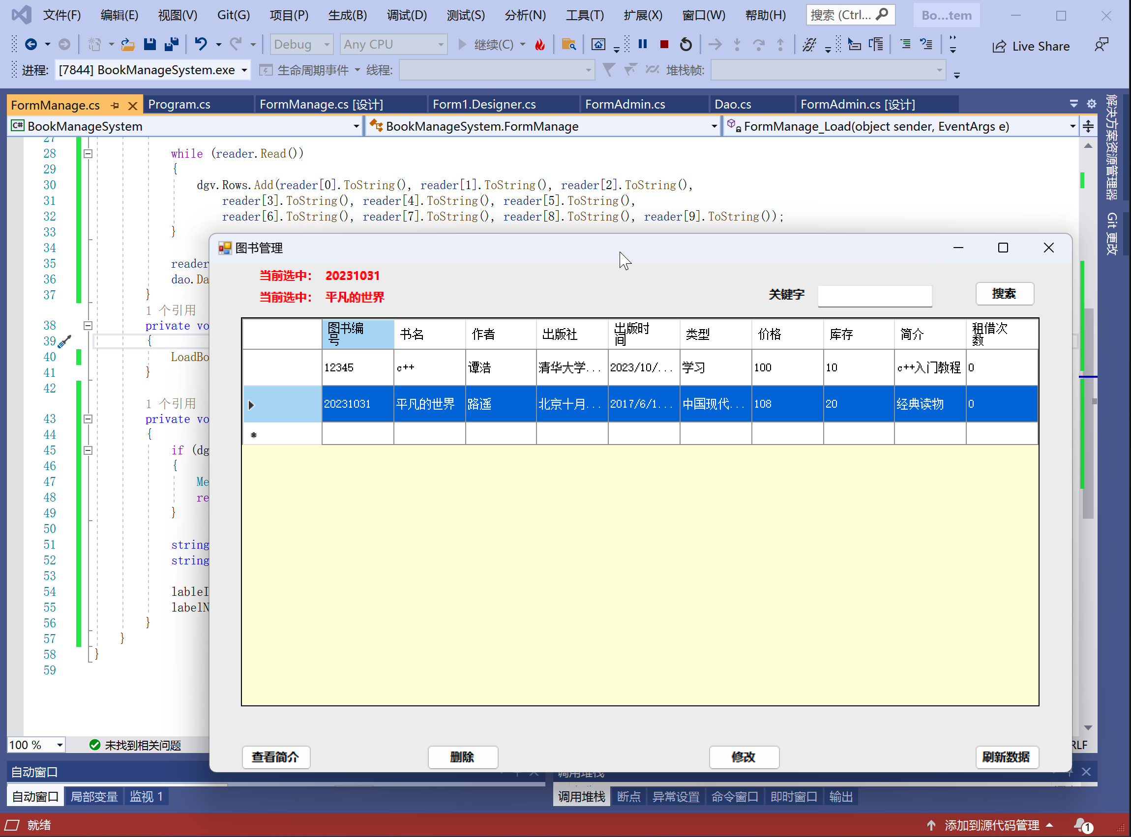 private void LoadBooks() { Dao dao = new Dao(); dao.connect(); string sql = "select* from T_Book"; SqlDataReader reader = dao.read(sql); while (reader.Read()) { dgv.Rows.Add(reader[0].ToString(), reader[1].ToString(), reader[2].ToString(), reader[3].ToString(), reader[4].ToString(), reader[5].ToString(), reader[6].ToString(), reader[7].ToString(), reader[8].ToString(), reader[9].ToString()); } reader.Close(); dao.DaoClose(); } private void FormManage_Load(object sender, EventArgs e) { LoadBooks(); }