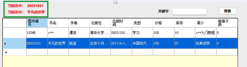 还实现了点击某行获取当前行的图书的编号和书名并显示在左上角