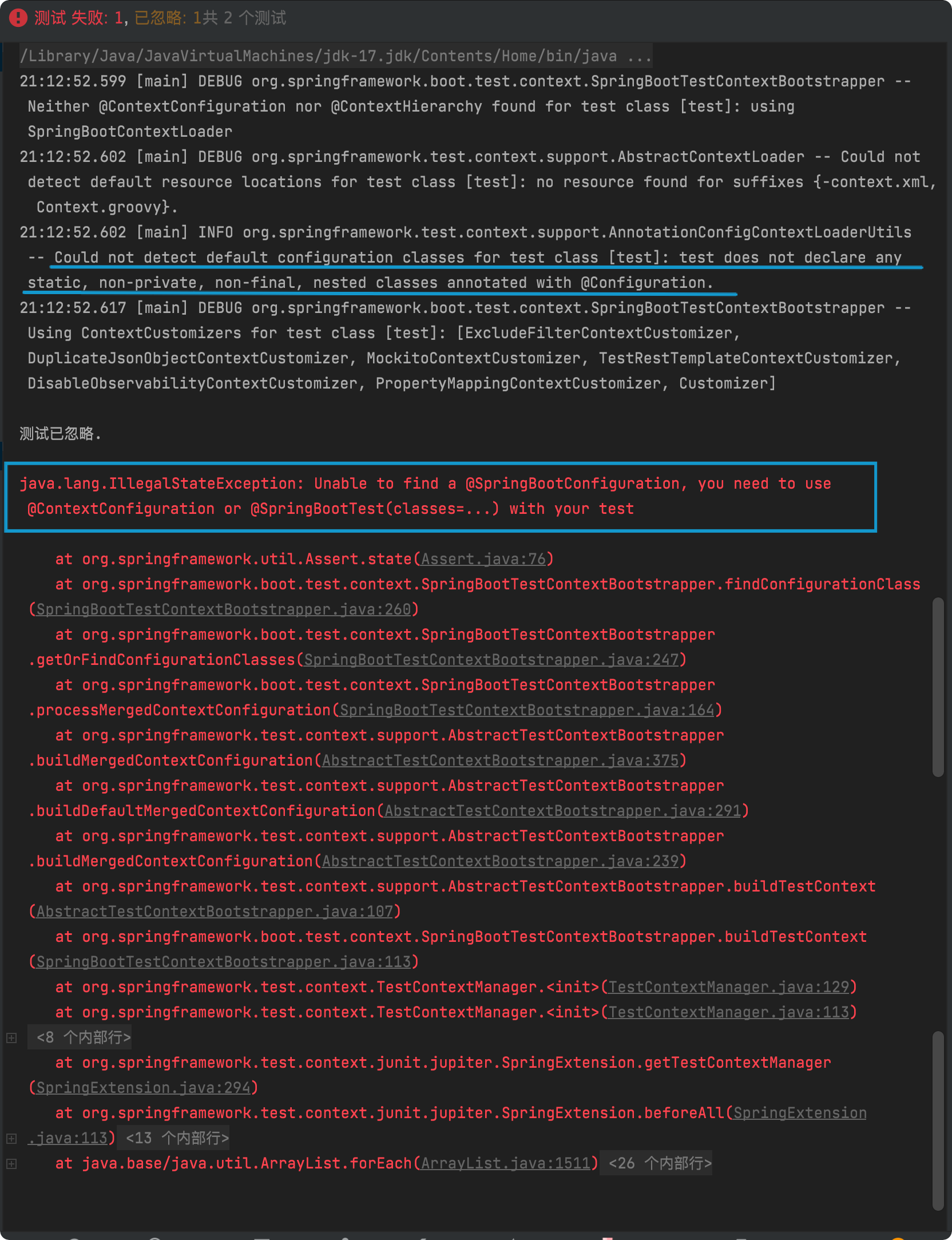 java.lang.IllegalStateException: Unable to find a @SpringBootConfiguration, you need to use @ContextConfiguration or @SpringBootTest(classes=...) with your test