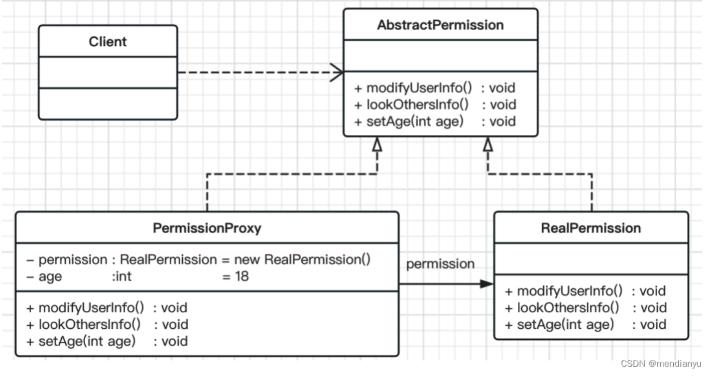 public interface AbstractPermission { //修改个人信息 public void modifyUserInfo(); //查看他人信息 public void lookOthersInfo(); //设置年龄 public void setAge(int age); } public class PermissionProxy implements AbstractPermission { private RealPermission permission = new RealPermission(); private int age = 18; //修改个人信息 @Override public void modifyUserInfo() { if (age < 18) { System.out.println("对不起,不能早恋"); } else if (age >= 18) { permission.modifyUserInfo(); } } //查看他人信息 @Override public void lookOthersInfo() { if (age < 18) { System.out.println("对不起,不能早恋"); } else if (age >= 18) { permission.lookOthersInfo(); } } //设置年龄 @Override public void setAge(int age) { this.age = age; } } public class RealPermission implements AbstractPermission { @Override public void modifyUserInfo() { System.out.println("修改用户信息"); } @Override public void lookOthersInfo() { System.out.println("查看他人信息"); } @Override public void setAge(int age) { } } import org.w3c.dom.Document; import org.w3c.dom.Node; import org.w3c.dom.NodeList; import javax.xml.parsers.DocumentBuilder; import javax.xml.parsers.DocumentBuilderFactory; import java.io.File; public class XMLUtil { public static Object getBean() { try { //创建DOM文档对象 DocumentBuilderFactory dFactory = DocumentBuilderFactory.newInstance(); DocumentBuilder builder = dFactory.newDocumentBuilder(); Document doc = builder.parse(new File("src/main/resources/config14.xml")); //获取包含类名的文本节点 NodeList nl = doc.getElementsByTagName("className"); Node classNode = nl.item(0).getFirstChild(); String cName = classNode.getNodeValue(); //通过类名生成实例对象并将其返回 Class c = Class.forName(cName); Object obj = c.newInstance(); return obj; } catch (Exception e) { e.printStackTrace(); return null; } } } public class Client { public static void main(String[] args) { AbstractPermission permission = (AbstractPermission) XMLUtil.getBean(); permission.modifyUserInfo(); permission.lookOthersInfo(); System.out.println("--------------"); permission.setAge(15); permission.modifyUserInfo(); permission.lookOthersInfo(); } }