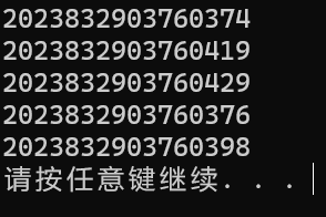 1 #include<stdio.h> 2 #include<stdlib.h> 3 #include<time.h> 4 #define N 5 5 #define N1 374 6 #define N2 465 7 int main(){ 8 int number; 9 int i; 10 11 srand( time(0));//以当前系统时间作为随机种子 12 13 for(i=0;i<N;++i){ 14 number = rand()%(N2 - N1 + 1) + N1;//随机得到一个数字 15 printf("202383290376%04d\n",number); 16 } 17 18 system("pause"); 19 return 0; 20 }