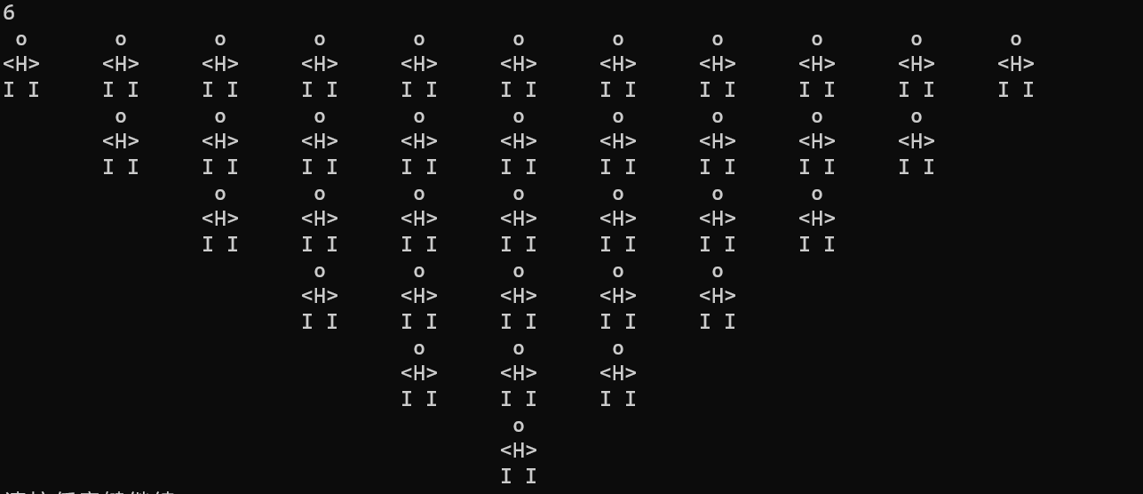 1 #include<stdio.h> 2 #include<stdlib.h> 3 4 int main() 5 { 6 int n; 7 int i,l,f,k,j; 8 9 scanf("%d",&n); 10 11 for(i=1;i<=n;i++) 12 { 13 int m; 14 for(m=1;m<=i-1;m++) 15 { 16 printf("\t"); 17 } 18 19 for(j = 1;j<=2*n-1-2*(i-1);j++) 20 { 21 printf(" o \t"); 22 23 } 24 printf("\n"); 25 26 for(k=1;k<=i-1;k++) 27 { 28 printf("\t"); 29 30 } 31 for(f=1;f<=2*n-1-2*(i-1);f++) 32 { 33 printf("<H>\t"); 34 35 } 36 printf("\n"); 37 38 for(k=1;k<=i-1;k++) 39 { 40 printf("\t"); 41 } 42 for(l = 1;l<=2*n-1-2*(i-1);l++) 43 { 44 printf("I I\t"); 45 } 46 printf("\n"); 47 48 } 49 system("pause"); 50 return 0; 51 52 53 }