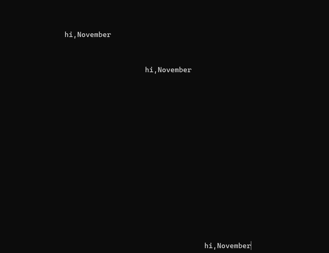 1 #include<stdio.h> 2 #include<stdlib.h> 3 #include<time.h> 4 #include<windows.h> 5 #define N 80 6 7 void print_text(int line, int col,char text[]); 8 void print_spaces(int n); 9 void print_blank_lines(int n); 10 11 int main(){ 12 int line,col,i; 13 char text[N] = "hi,November"; 14 15 srand(time(0)); 16 17 for(i = 1;1 <= 10 ;++i) 18 { 19 line = rand() % 25; 20 col = rand() % 80; 21 print_text(line,col,text); 22 sleep(1000); 23 } 24 return 0; 25 26 27 } 28 29 void print_spaces(int n){ 30 int i; 31 32 for(i = 1;i <= n ; i++) 33 printf(" "); 34 35 36 } 37 38 void print_blank_lines(int n){ 39 int i; 40 41 for(i = 1;i <= n ; i++) 42 printf("\n"); 43 44 45 } 46 47 void print_text(int line,int col,char text[]){ 48 print_blank_lines(line-1); 49 print_spaces(col-1); 50 printf("%s",text); 51 52 53 }