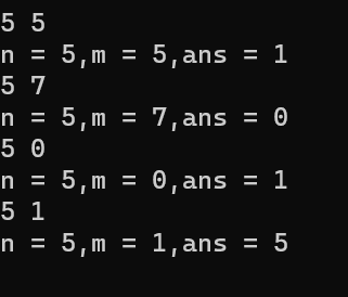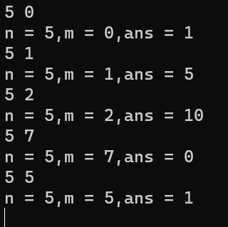 1 #include<stdio.h> 2 3 int func(int n,int m); 4 5 int main(){ 6 int n,m ; 7 8 while(scanf("%d%d",&n,&m) !=EOF) 9 printf("n = %d,m = %d,ans = %d\n",n,m,func(n,m)); 10 return 0; 11 } 12 13 int func(int n, int m){ 14 int i; 15 int ans; 16 if(n==m) 17 ans=1; 18 else if(n<m) 19 ans = 0; 20 else if (m==0) 21 ans = 1; 22 23 24 else 25 ans=func(n-1,m)+func(n-1,m-1); 26 return ans; 27 }