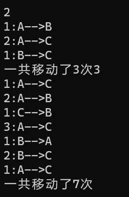 1 #include<stdio.h> 2 #include<stdlib.h> 3 void hanoi(unsigned int n,char from,char temp,char to); 4 void moveplate(unsigned int n ,char from,char to); 5 int i =0; 6 int main(){ 7 unsigned int n; 8 9 10 while(scanf("%u",&n)!=EOF) 11 { 12 hanoi(n,'A','B','C'); 13 printf("一共移动了%d次",i); 14 i=0; 15 16 17 } 18 system("pause"); 19 return 0; 20 21 } 22 void hanoi(unsigned int n ,char from,char temp,char to) 23 { 24 25 if(n==1){ 26 moveplate(n,from,to); 27 28 } 29 else 30 { 31 hanoi(n-1,from,to,temp); 32 33 moveplate(n,from,to); 34 hanoi(n-1,temp,from,to); 35 36 } 37 } 38 void moveplate(unsigned int n,char from,char to) 39 { 40 41 printf("%u:%c-->%c\n",n,from,to); 42 i++; 43 }