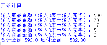 inmoney = float(input('输入商品金额(输入0表示输入完毕):'))