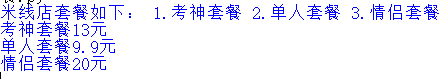 美团外卖的商家一般都会推出几款套餐。例如,某米线店套餐:考神套餐13元,单人套餐9.9元,情侣套餐20元。编程实现输出该米线店推出的套餐。效果如图所示。