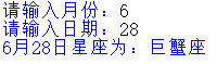 根据生日可以判断出所属星座。例如:生日为7月1日,属于巨蟹座。编程实现根据输入的出生月份和日期判断所属星座。效果如图所示。