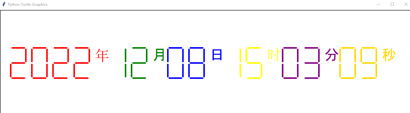 import turtle, datetime def drawGap(): # 绘制数码管间隔 turtle.penup() turtle.fd(5) def drawLine(draw): # 绘制单段数码管 drawGap() turtle.pendown() if draw else turtle.penup() turtle.fd(40) drawGap() turtle.right(90) def drawDigit(d): # 根据数字绘制七段数码管 drawLine(True) if d in [2, 3, 4, 5, 6, 8, 9] else drawLine(False)#日中间那一横 drawLine(True) if d in [0, 1, 3, 4, 5, 6, 7, 8, 9] else drawLine(False)#日右下角那一竖 drawLine(True) if d in [0, 2, 3, 5, 6, 8, 9] else drawLine(False)#日下面那一横 drawLine(True) if d in [0, 2, 6, 8] else drawLine(False)#日左下角那一竖 turtle.left(90) drawLine(True) if d in [0, 4, 5, 6, 8, 9] else drawLine(False)#日左上角那一竖 drawLine(True) if d in [0, 2, 3, 5, 6, 7, 8, 9] else drawLine(False)#日上面那一横 drawLine(True) if d in [0, 1, 2, 3, 4, 7, 8, 9] else drawLine(False)#日右上角那一竖 turtle.left(180) turtle.penup() turtle.fd(20) def drawDate(date): turtle.pencolor("red") for i in date: if i == '-': turtle.write('年', font=("Arial ", 36, "normal")) turtle.pencolor("green") turtle.fd(50) elif i == '=': turtle.write('月', font=("Arial", 36, "normal")) turtle.pencolor("blue") turtle.fd(50) elif i == '+': turtle.write('日', font=("Arial", 36, "normal")) turtle.pencolor("yellow") turtle.fd(50) elif i == '*': turtle.write('时', font=("Arial", 36, "normal")) turtle.pencolor("purple") turtle.fd(50) elif i == '/': turtle.write('分', font=("Arial", 36, "normal")) turtle.pencolor("gold") turtle.fd(50) elif i == '$': turtle.write('秒', font=("Arial", 36, "normal")) else: drawDigit(eval(i)) def main(): turtle.speed(30) #海龟移动速度 turtle.setup(1400, 350, 200, 200)#设置窗口大小 turtle.penup() turtle.fd(-650) turtle.pensize(5) drawDate(datetime.datetime.now().strftime('%Y-%m=%d+%H*%M/%S$')) turtle.hideturtle() turtle.done() main()