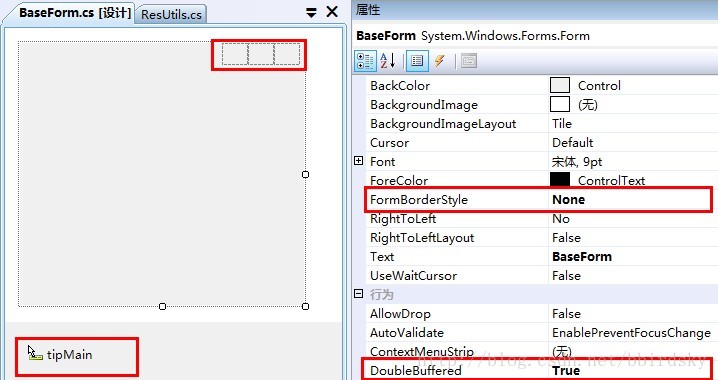 1、此篇的核心就是BaseForm窗口基类,首先在Frame文件夹下创建一个普通的Form窗口,并做例如以下属性设置:
