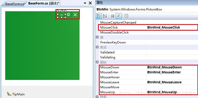 2>加入三个PictureBox分别用于替代最小化、最大化、关闭button,也能够尝试使用Button替代;