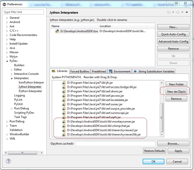 - Step 4: 点击“New”button并选择SDK/Tools/Lib/以下的Jython jar包,然后点击Okbutton