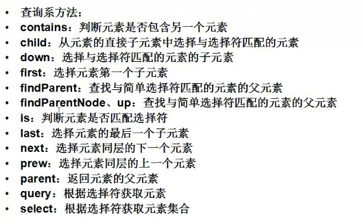 Ext.onReady(function(){ Ext.create('Ext.panel.Panel',{//创建一个面板 title:'我的面板' , width:'100%' , height:400 , renderTo:Ext.getBody(), html:'<div id=d1><span id=sp>我是sp的内容</span><div id=d2>我是d2的内容</div></div>' }); //查询系最经常使用的方法: //Ext.dom.Element get fly getDom var d1 = Ext.get('d1'); var sp = Ext.get('sp'); //查询系方法: //1: contains:推断元素是否包括还有一个元素 alert(d1.contains(sp)); alert(d1.contains('sp')); //2: child:从元素的直接子元素中选择与选择符匹配的元素 (返回的仅仅是一个元素。并不能返回数组) ,2个參数 第二个參数是可选的 假设为true表示取得的是原生的HTMLElement元素 var ch1 = d1.child('span'); //Ext.dom.Element alert(ch.dom.innerHTML); var ch2 = d1.child('span',true); //HTMLElement alert(ch.innerHTML); //3: down:选择与选择符匹配的元素的子元素//findParentNode、up:查找与简单选择符匹配的元素的父元素 var ch1 = d1.down('#d2'); alert(ch1.dom.innerHTML); //4: first:选择元素第一个子元素 //last:选择元素的最后一个子元素 var f1 = d1.first('div'); alert(f1.dom.innerHTML); //5: findParent:查找与简单选择符匹配的元素的父元素 //parent:返回元素的父元素 var parent = sp.findParent('div'); alert(parent.innerHTML); //6: is:推断元素是否匹配选择符 alert(d1.is('div')); //7: next:选择元素同层的下一个元素 //prew:选择元素同层的上一个元素 var next = sp.next(); alert(next.dom.nodeName); //8: Ext.query:依据选择符获取元素 (Ext.dom.Element.query) var arr = Ext.query('span','d1'); //HTMLElement[] Ext.Array.each(arr , function(item){ alert(item.innerHTML); }); //9: Ext.select/Ext.dom.Element.select:依据选择符获取元素集合 // 返回的都是元素集合: Ext.dom.CompositeElementLite(HTMLElemennt)/Ext.dom.CompositeElement(Ext.dom.Element) // 參数说明: 3个參数 , // 1:selector 选择器 (不要使用id选择器) // 2:返回的集合对象(boolean false:Ext.dom.CompositeElementLite true:Ext.dom.CompositeElement) // 3: 指定的根节点開始查找 //參数为false时的 var list1 = Ext.select('span',false,'d1');//Ext.dom.CompositeElementLite Ext.Array.each(list1.elements,function(el){ alert(el.innerHTML); }); //參数为true时的 var list2 = Ext.select('span',true,'d1');//Ext.dom.CompositeElement Ext.Array.each(list2.elements,function(el){ alert(el.dom.innerHTML); }); });