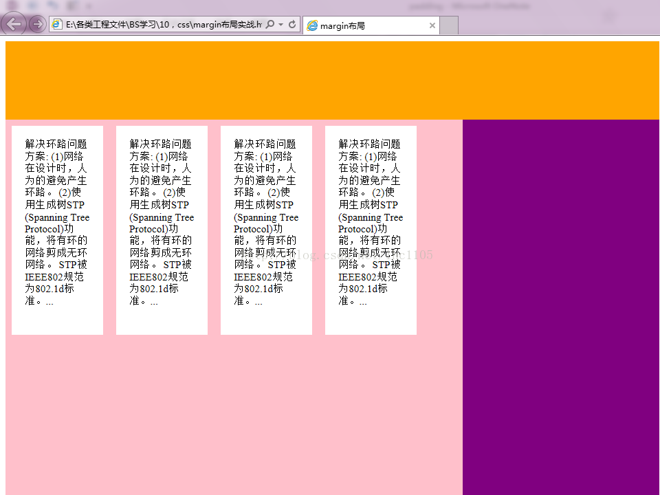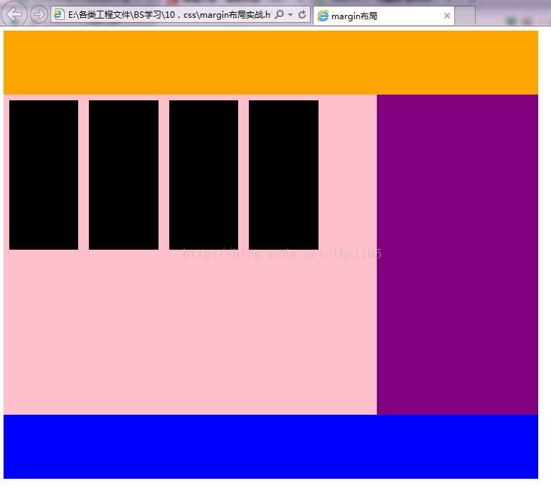 <html> <head> <meta http-equiv="Content-Type" content="text/html; charset=utf-8" /> <title>margin布局</title> </head> <style type="text/css"> #container{ width: 1002px; background: gray; } #header{ height: 120px; background: orange; } #main{ background: green; height: 600px; } #lside{ width: 700px; height: 600px; float: left; background: pink; } .four{ width: 130px; height: 280px; float: left; margin: 10px; background: black; } #rside{ width: 302px; height: 600px; background: purple; float: right; } #footer{ height: 120px; background: blue; } </style> <body> <div id="container"> <div id="header"></div> <div id="main"> <div id="lside"> <div class="four"></div> <div class="four"></div> <div class="four"></div> <div class="four"></div> </div> <div id="rside"></div> </div> <div id="footer"></div> </div> </body> </html>