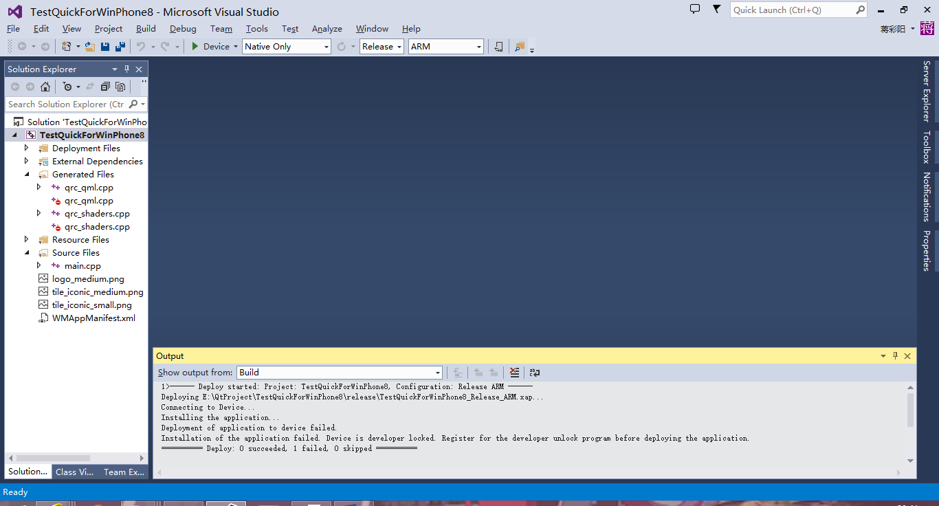 上次程序可以在模拟器上执行,可是我们指定Windows Phone 8.1作为开发套件,而且通过“E:\Develop\Qt5.3.1ForWinRT\5.3\winphone_arm\bin\qmake -tp vcTestSimpleForWindowsPhone8.pro "CONFIG+=windeployqt"”生成了vcxproj文件在Visual Studio14上构建。可是一開始出现了这种错误: