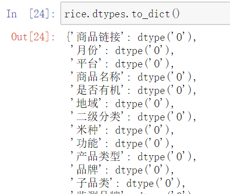 1.检查检查pd.DataFrame中所有字段的dtypes,因为字段太多不会全部显示,转换成字典后一幕了然,而且全部显示