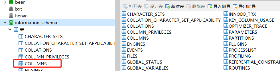 information_schema库中有一个名为COLUMNS的表,这个表中记录了数据库中所有表的字段信息。