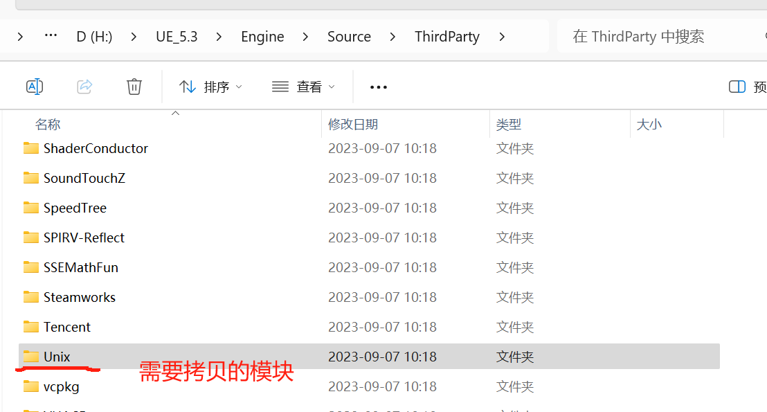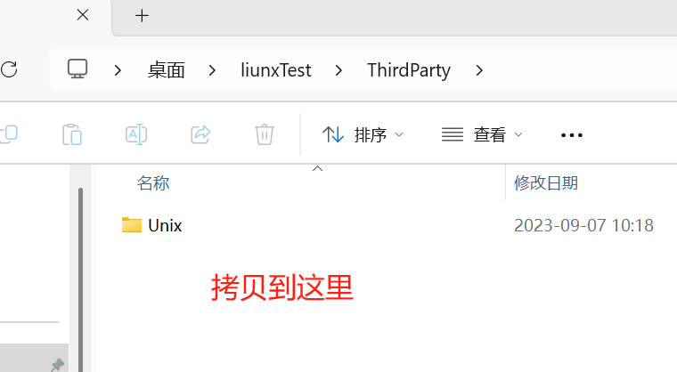 3.再在linuxTest下创建一个文件夹叫ThirdParty,把 Engine/Source/ThirdParty/Unix模块拷贝进去