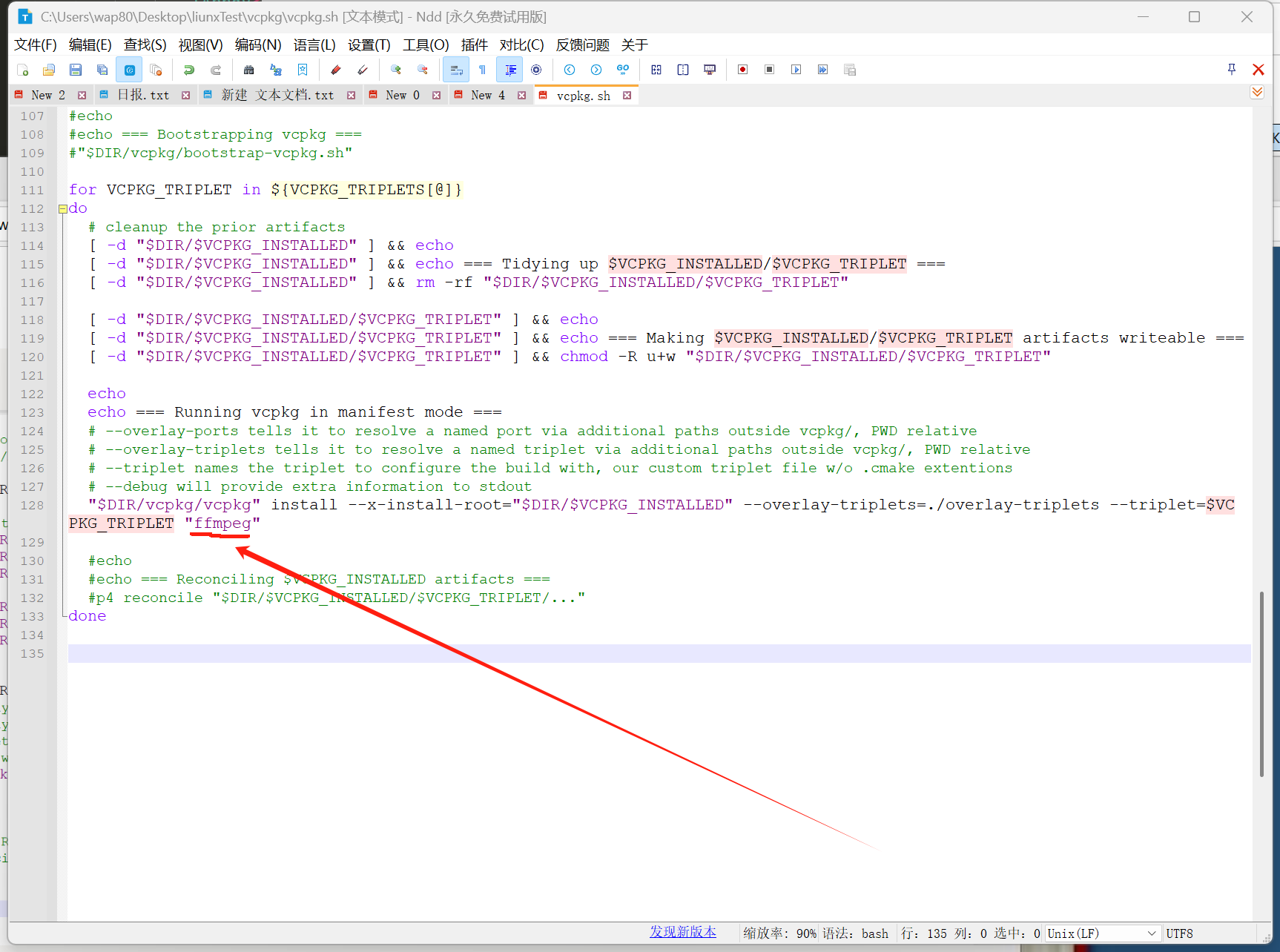 5.编辑vcpkg.sh,在图中的位置设置你需要的第三方库,比如我需要编译ffmpeg库