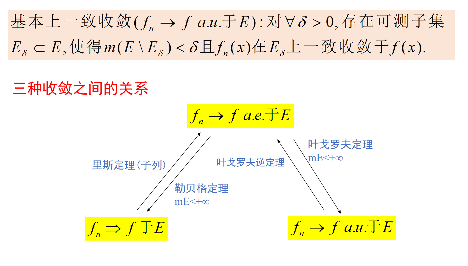 勒贝格定理:如果E的测度有限,那么a.e.收敛可以推出依测度收敛.