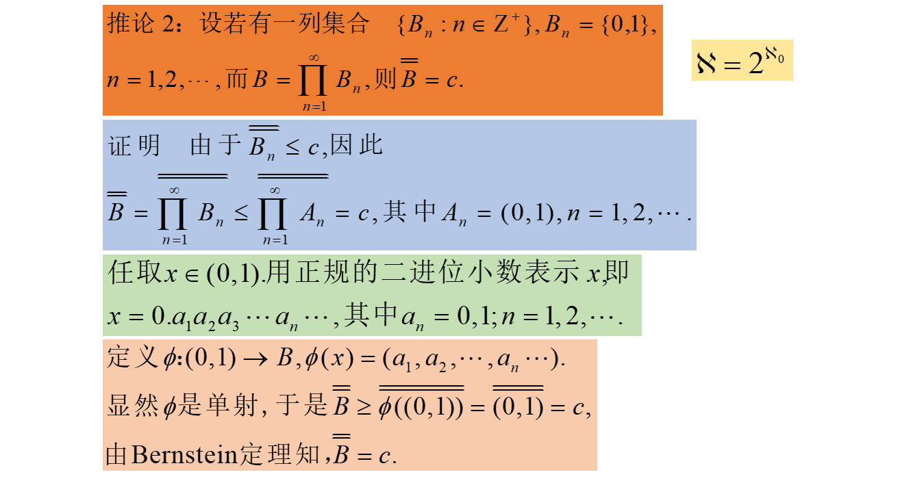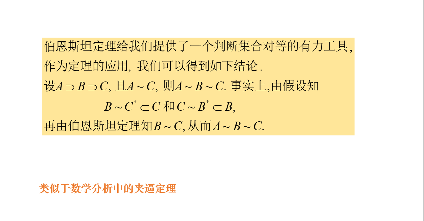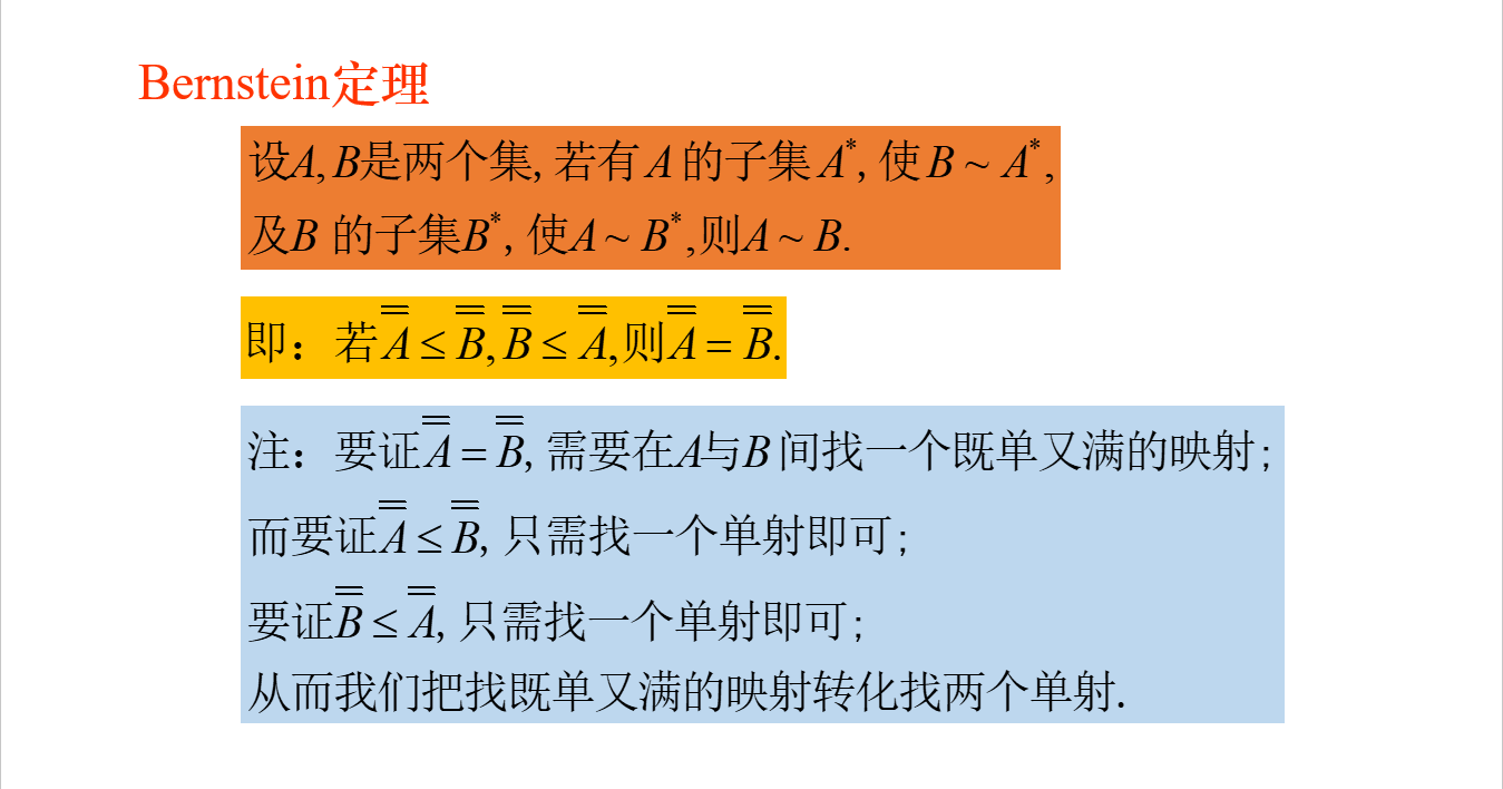 伯恩斯坦定理是证明两个集合对等的重要工具。它将证明集合对等中寻找双射的过程转化为寻找两个单射。